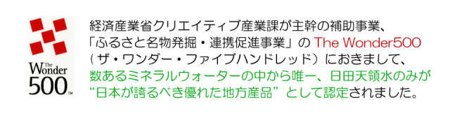 この度、経済産業省クリエイティブ産業課が主幹の補助事業、「ふるさと名物発掘・連携促進事業」のThe Wonder500(ザ・ワンダー・ファイブハンドレッド)におきまして、数あるミネラルウォーターの中から唯一、日田天領水のみが”日本が誇るべき優れた地方産品”として認定されました。